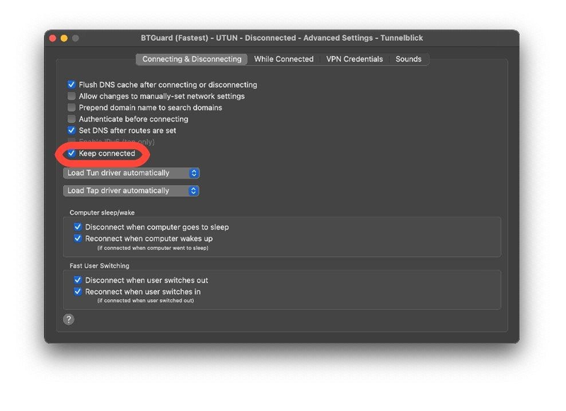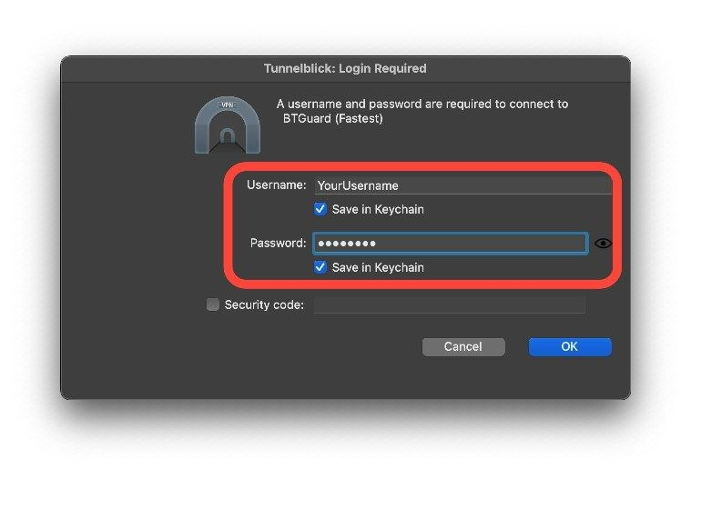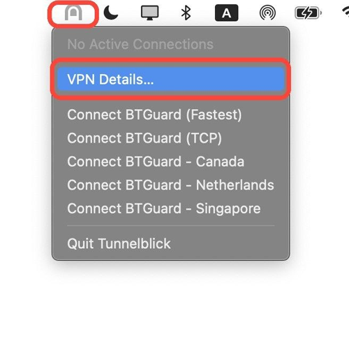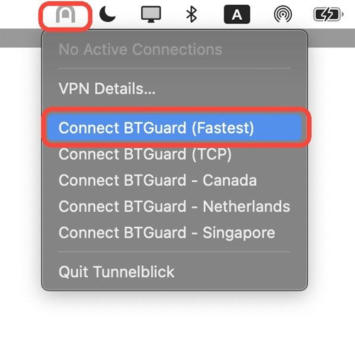 - 1. Click on the Tunnelblick icon in the menu bar and select Connect BTGuard (Fastest) or any of the other servers.