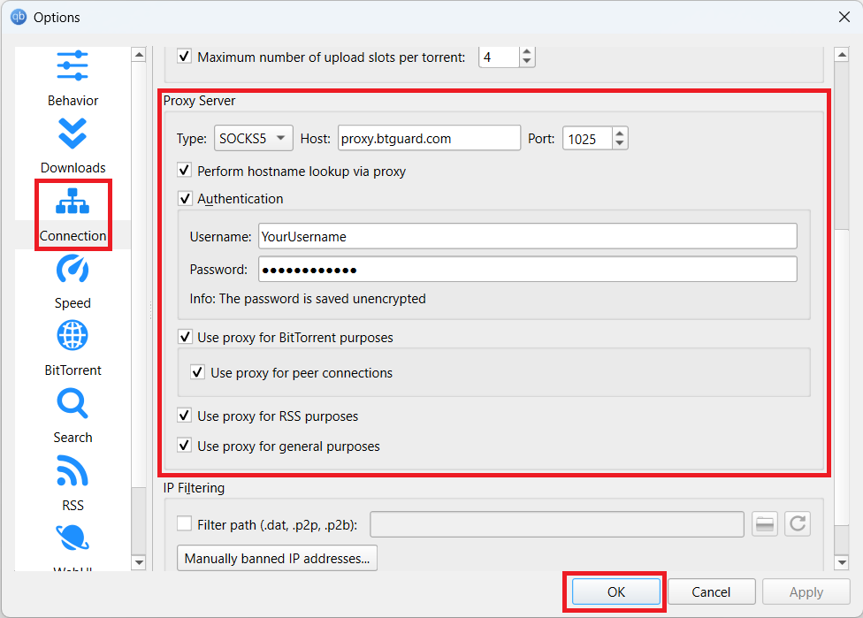 Both username and password are case sensitive. Make sure not to add/forget Capital Letters. - 5. Click OK and restart qBittorrent