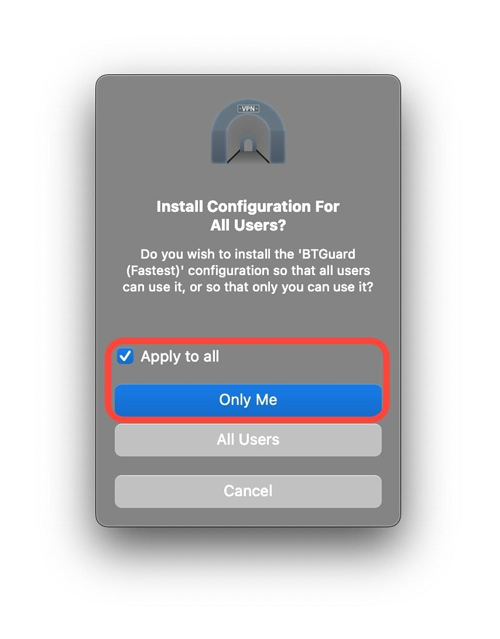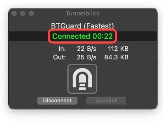 - 1. Click on the Tunnelblick icon in the menu bar and select Connect BTGuard (Fastest) or any of the other servers.