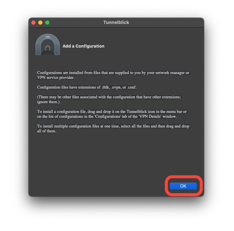 - 9. Find the Tunnelblick icon in your menu bar (top right), click on it and select VPN Details.