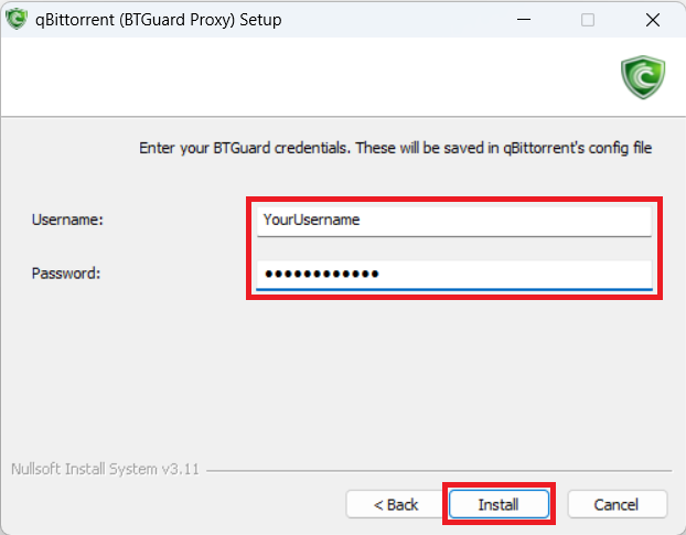 Both username and password are case sensitive. Make sure not to add/forget Capital Letters. - 6. Click Install and click through the qBittorrent installation.